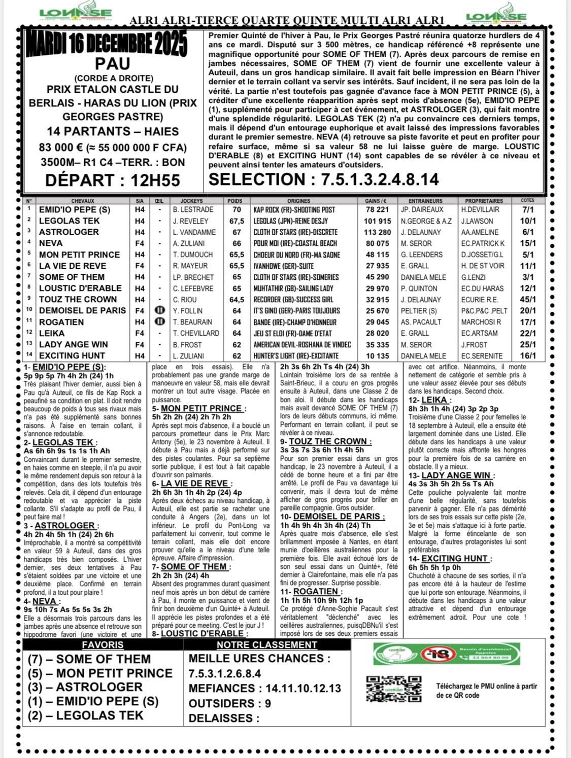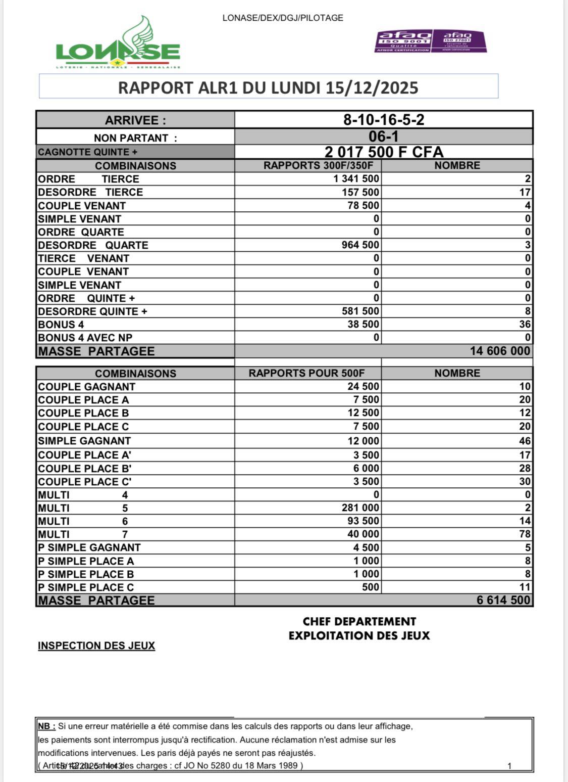 Arrivé, gain, programme et pronostic de alr1 du jour 16-12-2025 LONASE