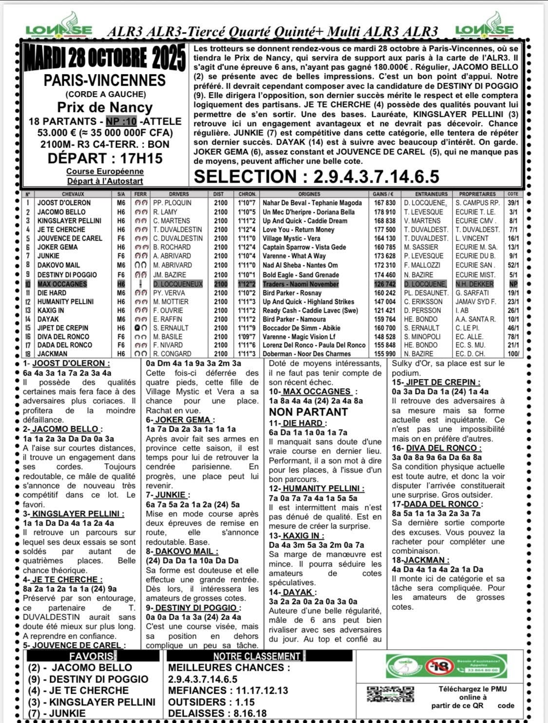 Arrivé, gain, programme et pronostic de alr3 du jour 28-10-2025 LONASE