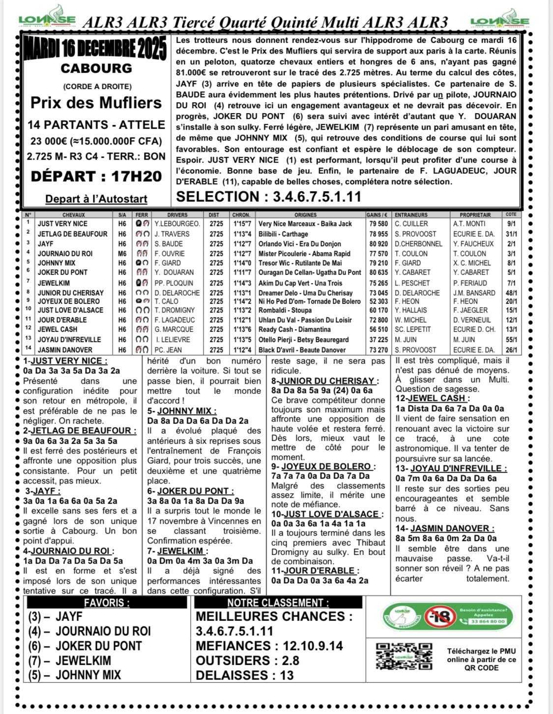 Arrivé, gain, programme et pronostic de alr3 du jour 16-12-2025 LONASE